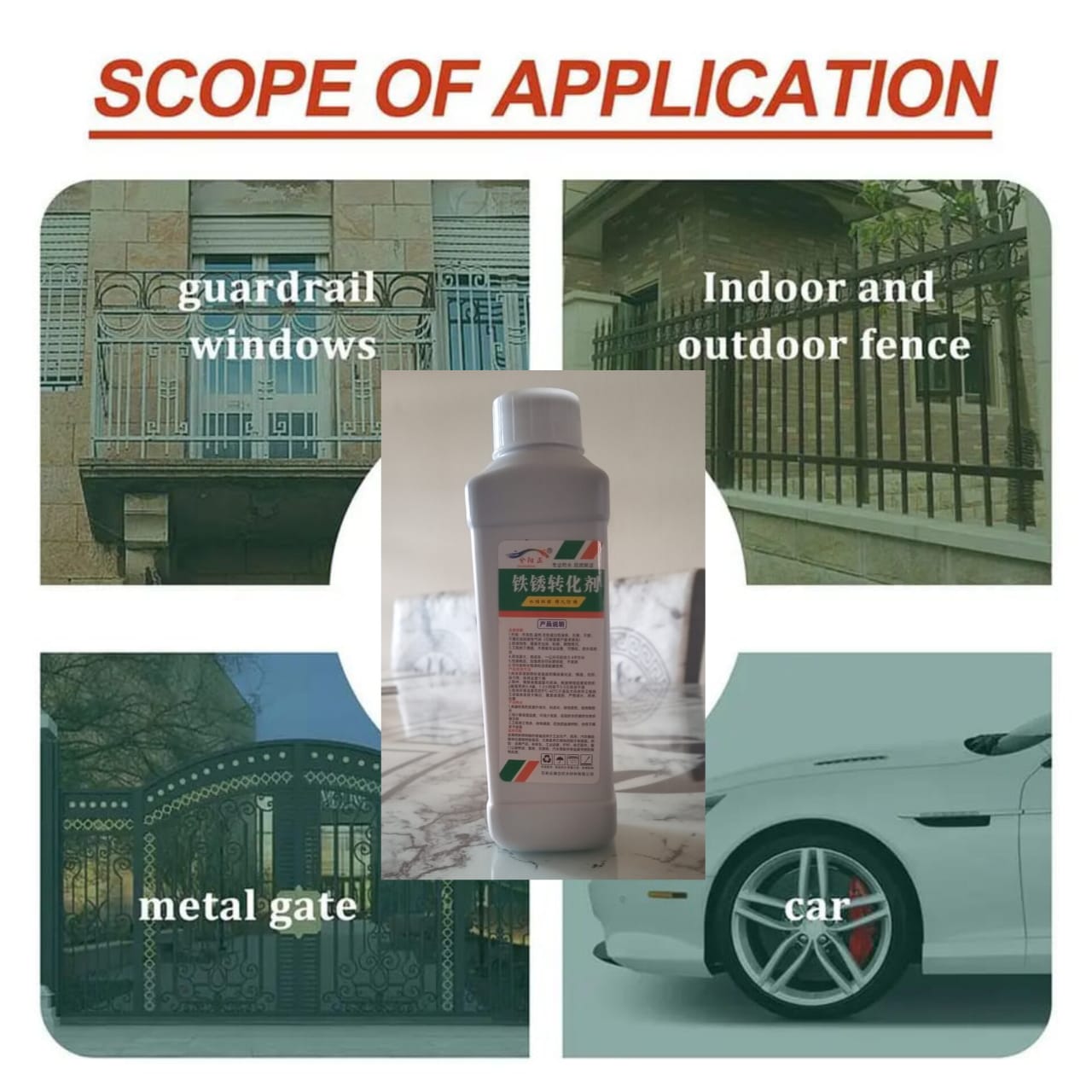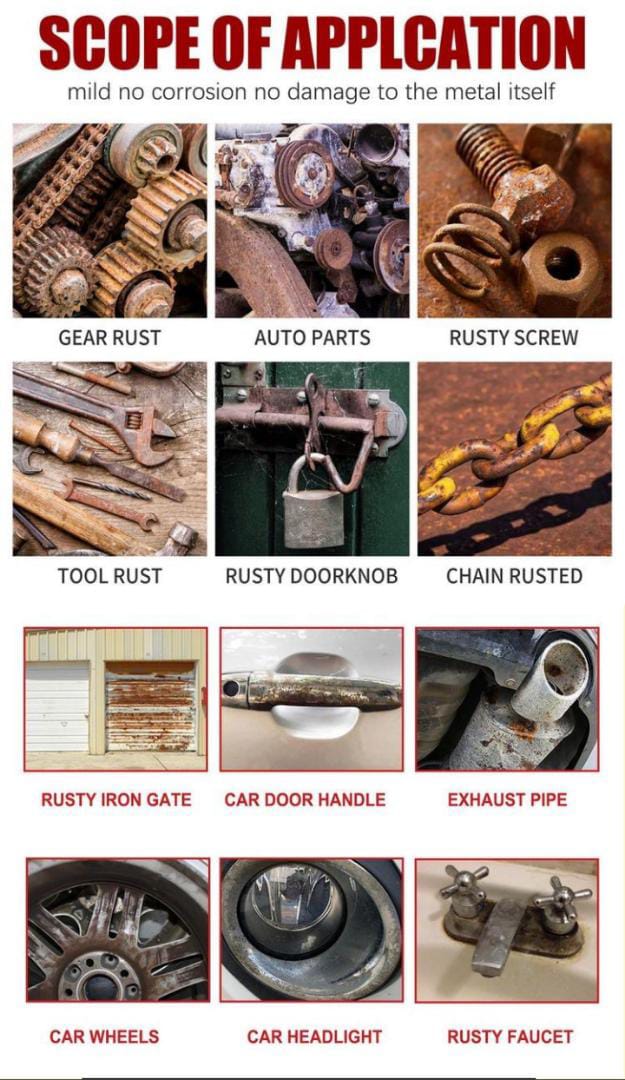 It can quickly and easily remove rust and restore the original primer color of metal objects. It revives and protects iron and metal surfaces on automobiles, car chassis, dumpsters, equipment, railings, chains, etc.