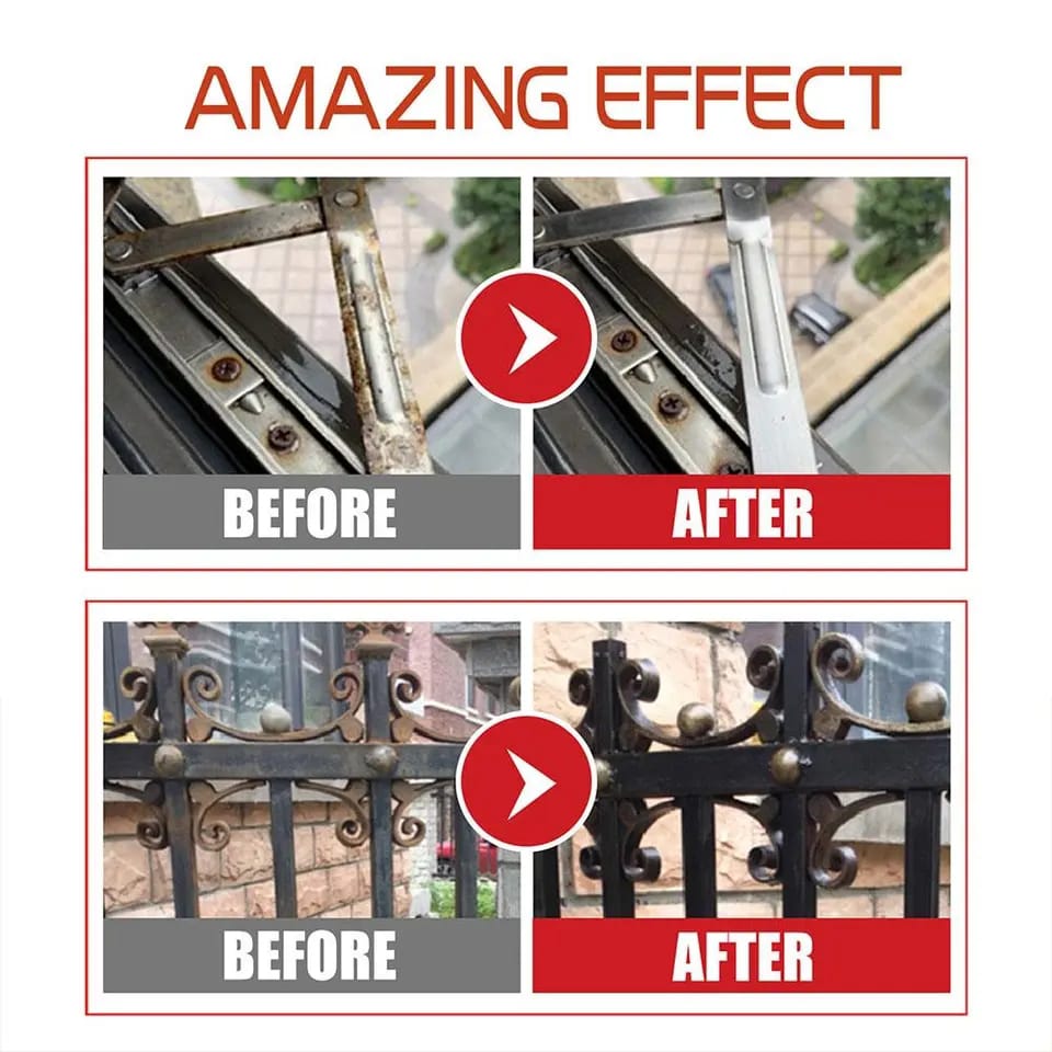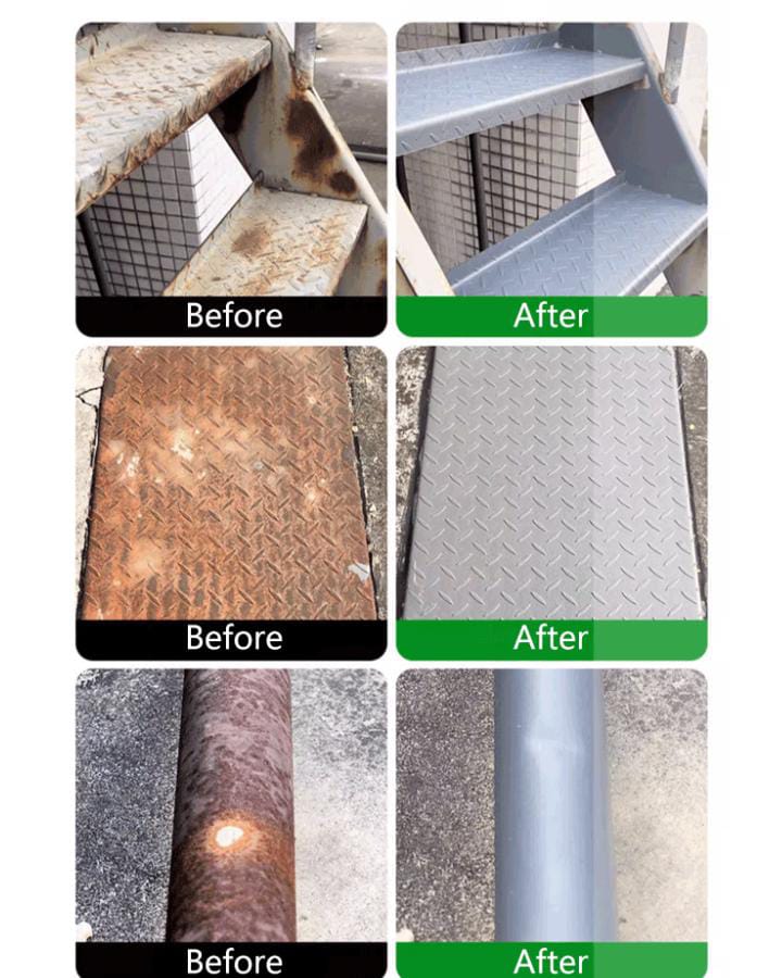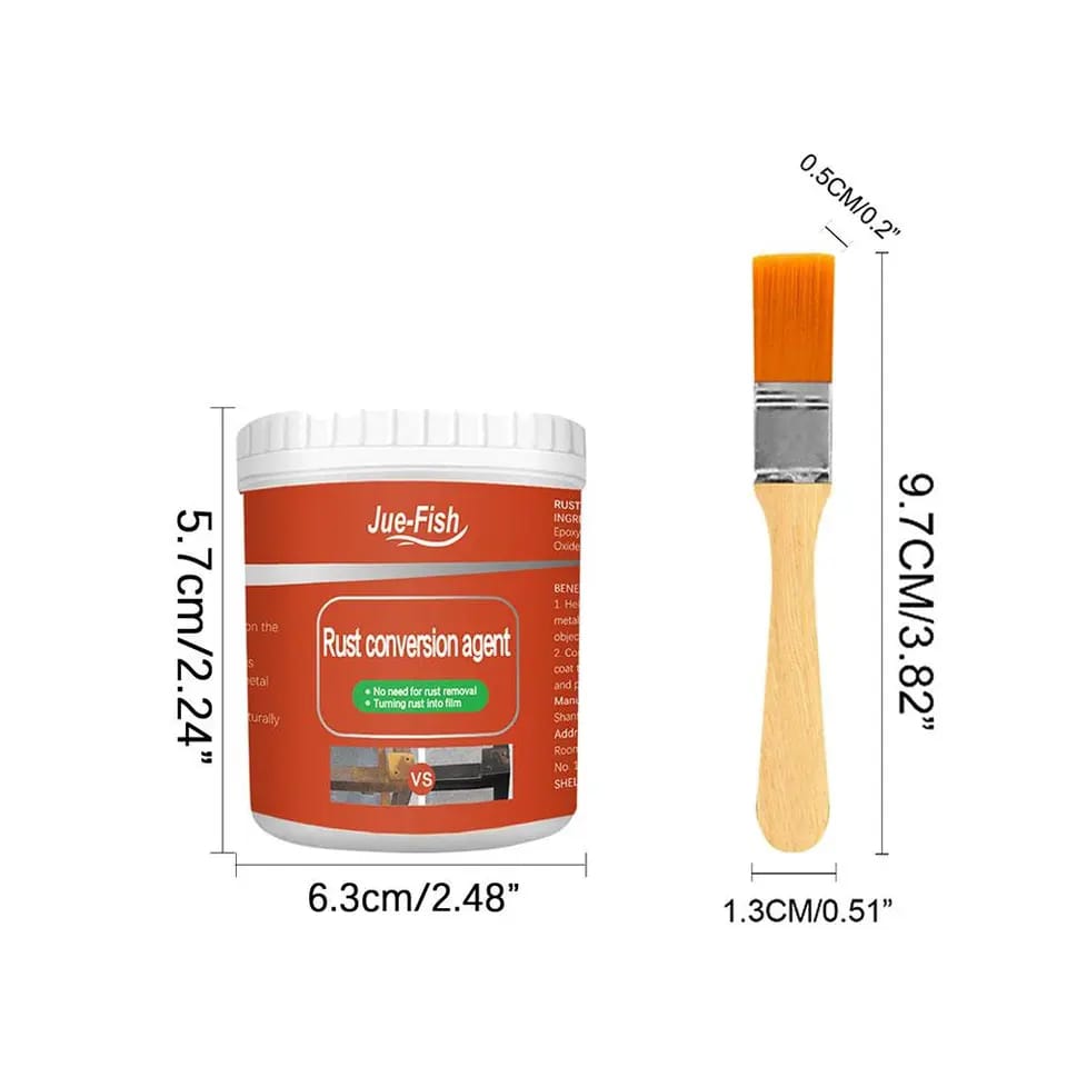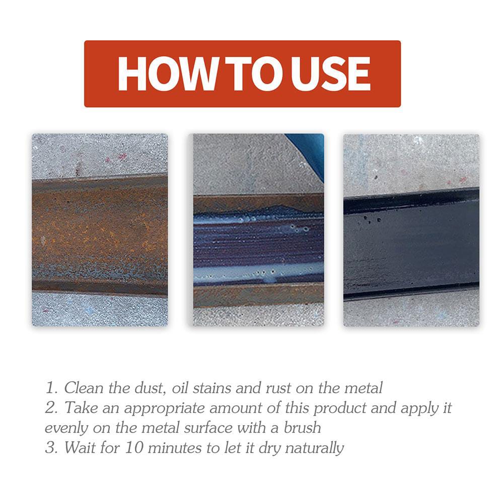 Wipe the dust and water stains clean off the metal surface, apply rust remover with a brush (included), and wait for 10 minutes to dry. Quickly form a protective film, prevent rust repeatedly.No more scraping, sandblasting or grinding!